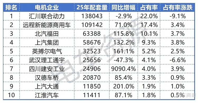 主机厂品牌占据主导,第三方头部份额收缩。第三方头部品牌苏州汇川联合动力虽仍居配套量榜首(配套量138043台),但同比下滑2.9%,市场占比22.0%,较此前大幅下跌9.1个百分点;而主机厂阵营增长势头强劲:北汽福田配套量65388台,同比大幅增长115.2%,市场占比10.1%(占比较此前上涨3.7个百分点);上汽集团配套量58676台,同比增速高达132.5%,市场占比9.3%(占比较此前上涨2.8个百分点),二者成为主机厂品牌中的增长主力。