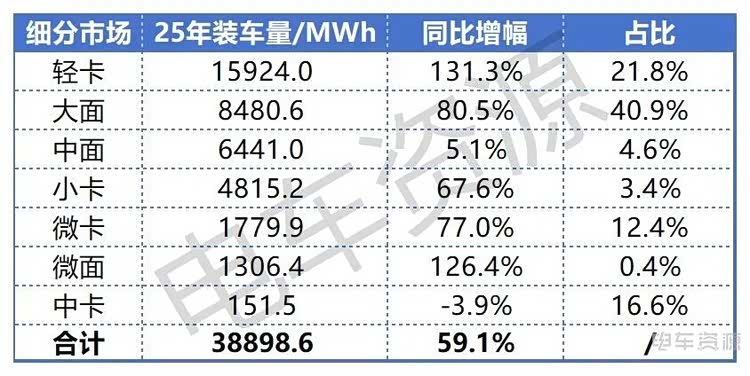 大电量趋势成增长核心引擎。2025年电池装车量的爆发,核心源于市场扩容与大电量升级的双重驱动。全年新能源物流车零售销量突破62.8万辆,物流车各细分领域同步扩容;更关键的是“大电量装车”已从趋势变为绝对主流,细分市场电量分布数据印证这一特征:轻卡120kWh以上大电量车型占比从2024年的38.2%翻倍至79.5%;小卡60kWh以上大电量占比提升至81.7%,增幅超19个百分点;大面、中面车型50kWh以上大电量占比分别增至39.8%、15.4%。全车型大电量占比的跃升,直接推高单车电池装载量,成为整体装车量增长的关键支撑。