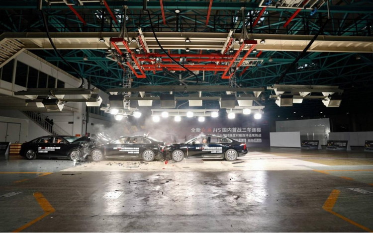 为了挑战更复杂的现实场景,红旗联合中汽中心进行了国内首次公开的“三车连环碰撞”测试,模拟了前车对撞、后车追尾的极端交通事故。在这次比单一碰撞严峻得多的试验中,三辆红旗H5的乘员舱均保持完好,碰撞后所有车门都能顺利打开,为逃生和救援创造了黄金条件;气囊、安全带约束系统均正常作用,燃油系统无泄漏。