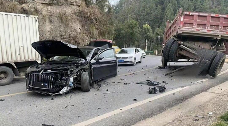 在网友的生活记录中,有一则红旗H5与大货车发生碰撞的真实案例,视频中,大货车的后轮轮毂、刹车部件甚至整个后桥壳体发生断裂、脱落,传动轴也出现严重损坏,看起来非常严重;而红旗H5车头部分出现明显溃缩和损坏,但驾驶舱主体结构保持完整。