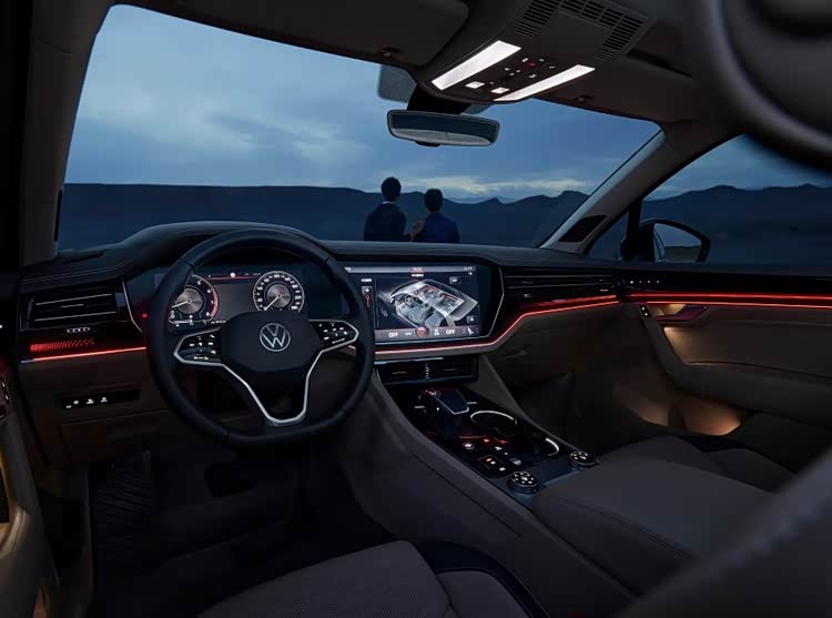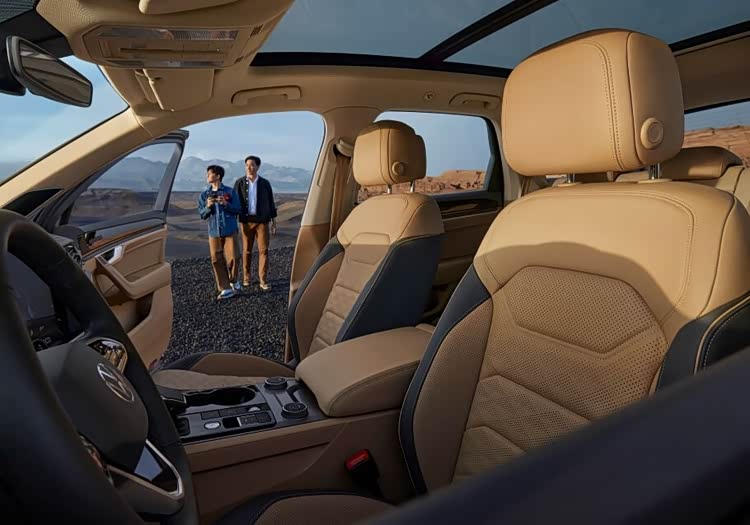 大众途锐则坚守稳重大气的基调,分体式LED大灯与加宽的多边形进气格栅相连,营造出宽体视觉效果,部分车型配备的R-Line运动套件,通过专属保险杠与车身同色包围,增添了几分动感。车尾回旋镖式尾灯设计简洁大方,单边双出排气布局虽不张扬,却与整车低调的气质相得益彰。