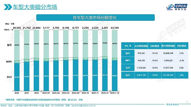 三大品类市场,轿车、SUV、MPV中,轿车全年同比增长3.1%,SUV同比增长5.0%,唯独一个MPV市场下滑2.3%。