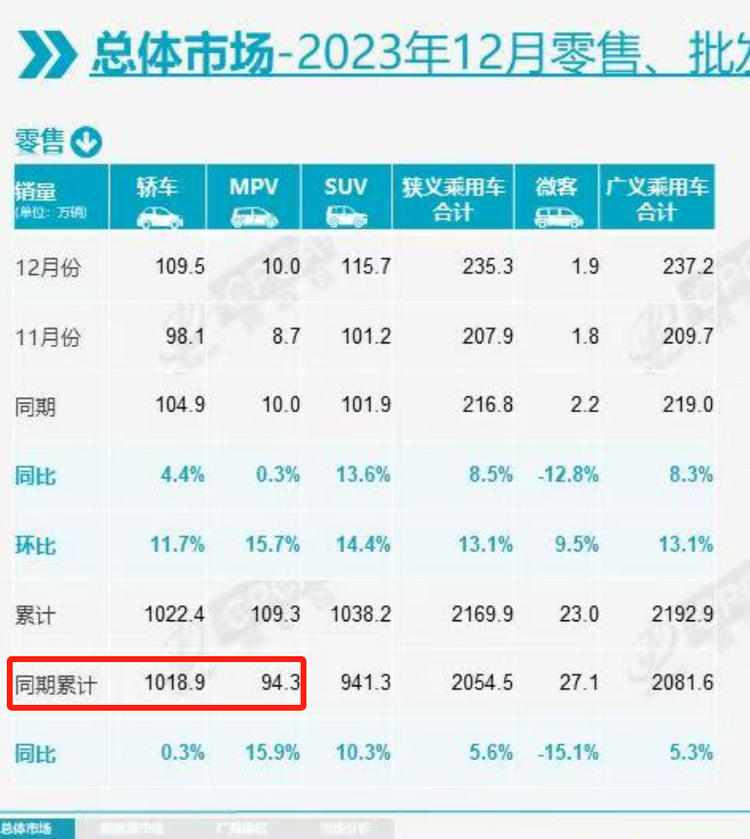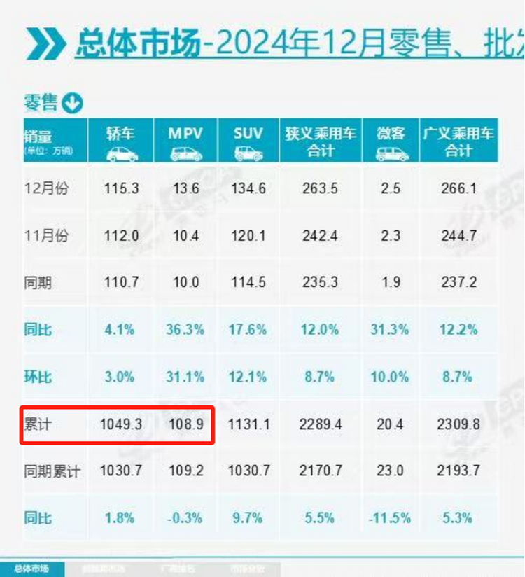 我们查了下24年的全年销量,MPV的累计销量为108.9万,而23年的全年销量94万。