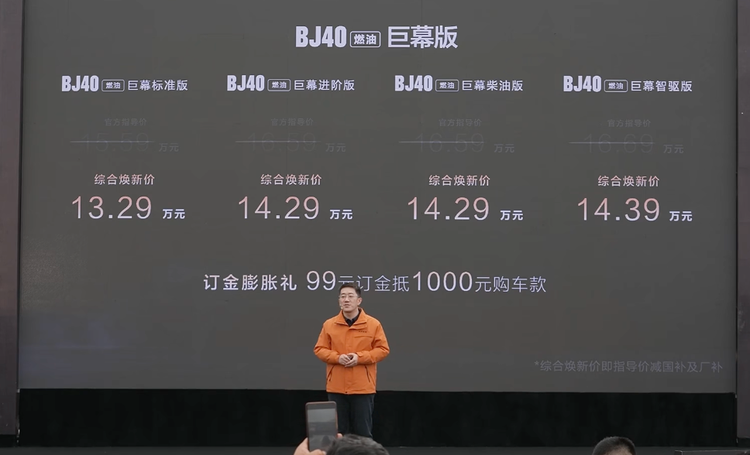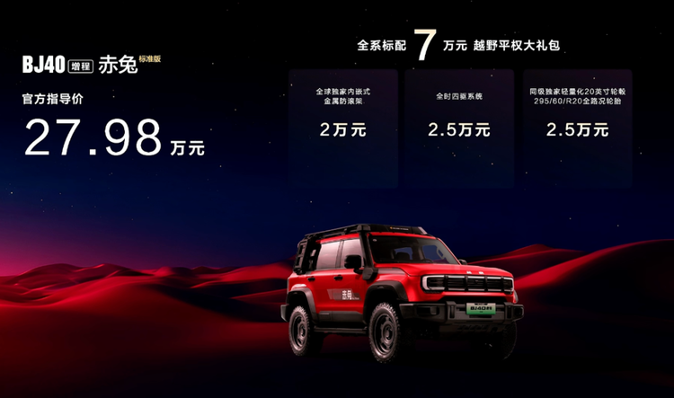 1月27日,北京越野举行BJ40新车发布会暨中国大环线启动盛典,活动上,北京越野官宣了中国大环线启动,同时 北京越野BJ40(参数|询价)三车齐发,其中,BJ40增程赤兔交付,该车售价:27.98万元,且三电终身质保。BJ40燃油巨幕版上市,综合焕新价:13.29万元-14.39万元。BJ40增程悦野飞行版预售,价格为:24.78万元。北京越野BJ40热销,增程、燃油双动力均受到市场好评,此外新车还推出了多重金融政策,具体如下图。作为现款增程版的进阶车型,新车聚焦越野核心硬件升级,未对外观大幅改动,原厂标配高位涉水喉、氮气减振器、全地形AT轮胎,直接具备中度越野能力,省去用户后期改装成本。