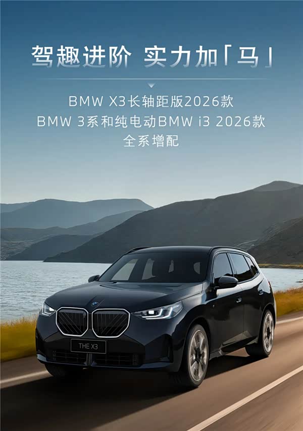 动力上,新款3系提供多种组合,汽油版继续使用2.0T和3.0T发动机,最大功率从156马力至374马力不等,搭配48V轻混系统。宝马X3搭载的是2.0T涡轮增压发动机,提供三种动力调校,最大功率分别为135kW、180kW和245kW,全系匹配8速手自一体变速箱和xDrive智能全轮驱动系统,百公里加速最快5.2秒。新款宝马i3基于纯电平台打造,搭载第五代eDrive电驱系统,最大功率250kW,CLTC续航里程分别为592km和526km。