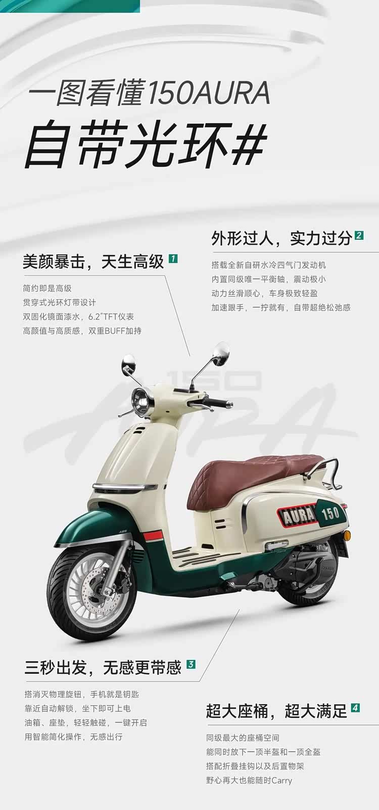 动力方面,春风150AURA搭载自研149cc水冷四气门发动机,最大功率11.8kW,并创新性加入平衡轴技术,有效抑制了传统踏板车常见的震动问题。