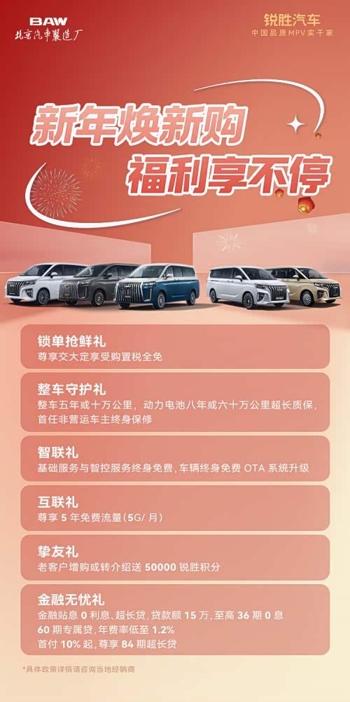 锐胜M8全面越级的产品实力,配合限时1-2月的春节促销六重优惠和至高2万元以旧换新补贴双重优惠,可以说是岁末MPV选购必看车型之一!关注MPV的用户不容错过!