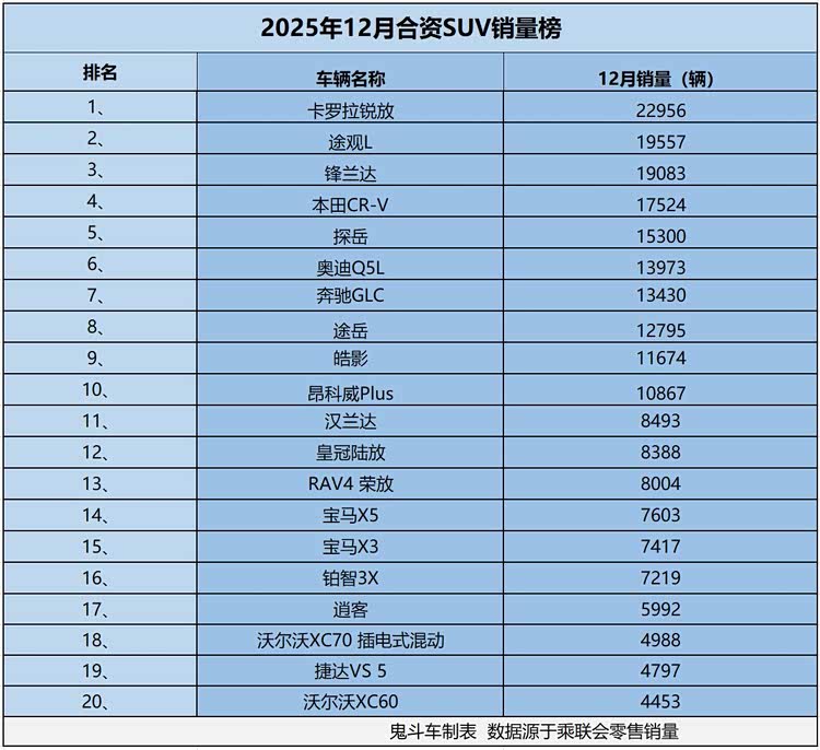 我们先来看看销量榜单,日前,乘联会发布2025年12月零售销量数据,鬼哥整理出12月合资SUV销量前二十榜单,结果发现,实际上,合资SUV卖得并没有那么差劲,销量过万的车型达到十款,接下来,看看具体排名与销量表现?
