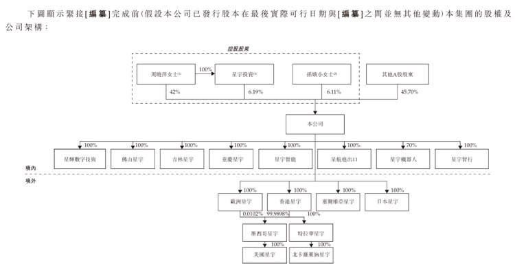 股权架构上,周晓萍、星宇投资及孙娥小为星宇股份的一组控股股东。截至最后实际可行日期,周晓萍及其他控股股东直接及间接控制星宇股份54.3%的表决权。