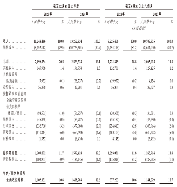 在2023年、2024年以及截至2024年9月30日和2025年9月30日,星宇股份的研发开支分别占收入的6.0%、4.9%、5.0%及6.0%。