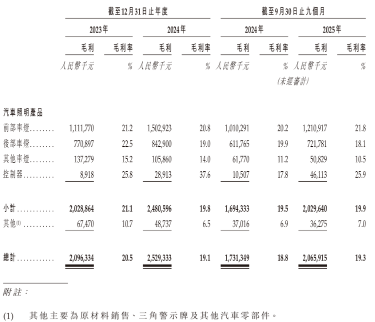 在2023年和2024年,星宇股份的毛利率为20.5%、19.1%,2025年前9个月为19.3%,较2024年同期的18.8%上升了0.5个百分点。