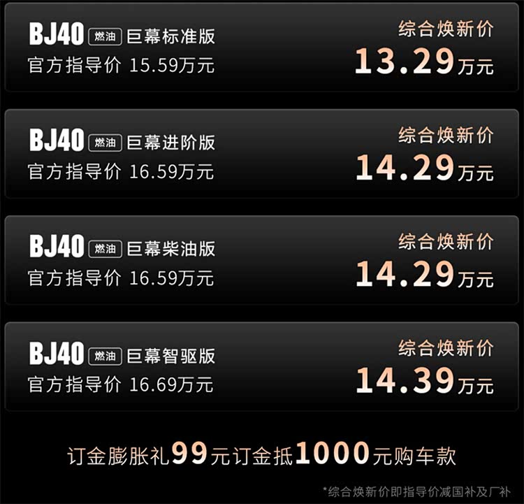 1月27日, 北京越野BJ40(参数|询价)家族三款新车同步登场,价格区间覆盖13.29~27.98万元,并开启一款新车的全球预售。这次更新不是简单的年度改款,而是针对不同细分需求和预算的精准打击。其中,BJ40增程赤兔标准版定价27.98万元,BJ40燃油巨幕版官方指导价15.59-16.69万元(综合焕新价低至13.29万起),而开启预售的BJ40增程悦野飞行版预售价24.78万元。单看价格就已经能感受到北京越野试图在竞争白热化的硬派越野市场重新划定战场的意图。