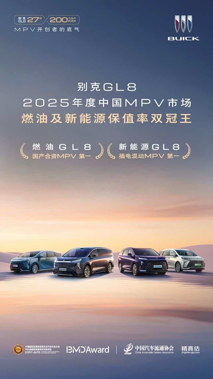 1月27日,中国汽车流通协会发布2025年度《中国汽车保值率报告》,别克GL8家族在合资MPV和插电混动MPV两大细分榜单中均获得冠军。其中,燃油GL8已连续四年蝉联合资MPV保值率第一。这是继中国国际贸易促进委员会和蓝本价联合发布的2025年度《中国汽车保值率排行榜》之后,GL8家族荣获的又一项保值率大奖。从入门到豪华,从燃油到新能源,权威双认证的GL8家族稳居“保值王者”,背后是百万家庭用真金白银投出的信任票。