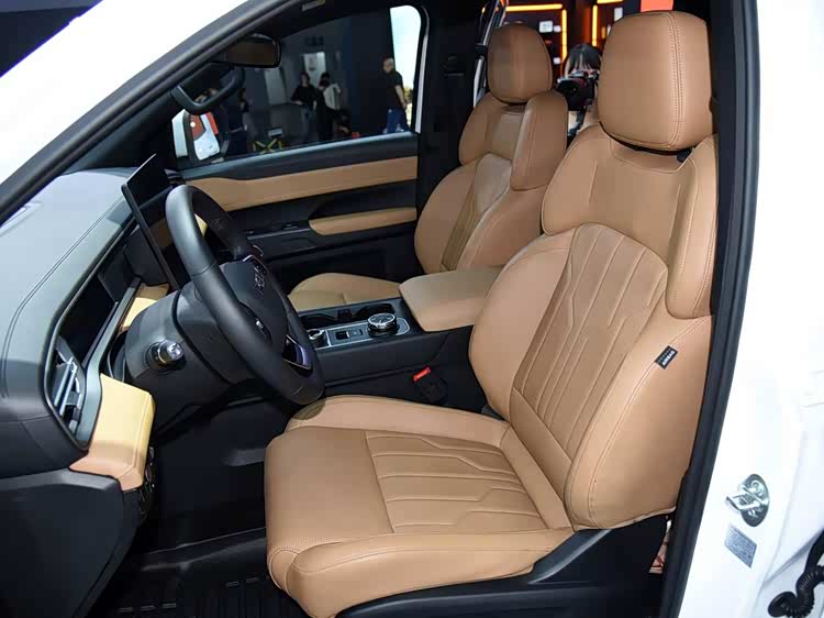 进入车内,威麟R08 EV的内饰设计显著向乘用化、舒适化靠拢,旨在打破传统工具型皮卡粗糙简陋的刻板印象。座舱采用浅棕色与黑色双色搭配,辅以多处镀铬装饰细节,营造出兼具质感与现代感的驾乘环境。车内配备了三辐式多功能方向盘,并可选装12.3英寸或15.6英寸的悬浮式中控大屏,大幅提升了车内的科技氛围与人机交互体验。