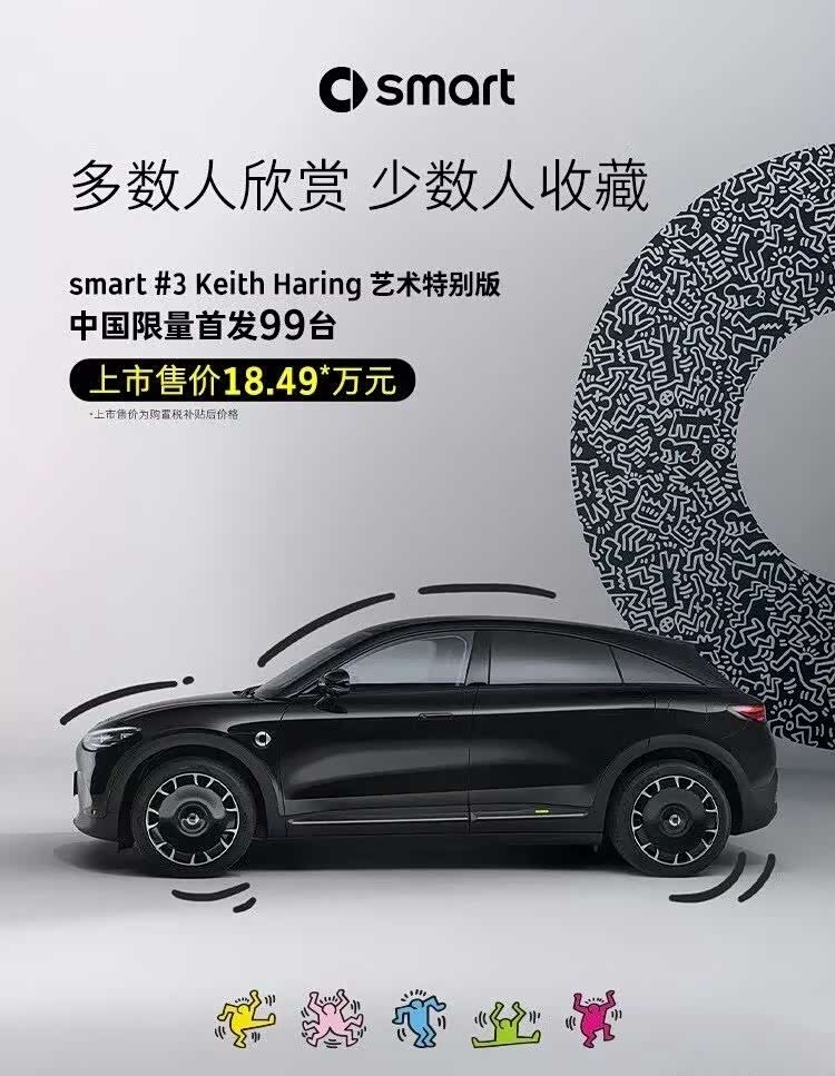 原来,这款车是奔驰 smart精灵#3(参数|询价),还是和已故涂鸦大师Keith Haring联名的艺术特别版,而且还是限量版,全球限量发售,仅 1000 台,国内首发只有99台,开售当天官网就直接干崩了。搞得有些网友不得不自嘲说:“不是我不买,是连加载页面都进不去。”手快有,手慢无,说的就是它。