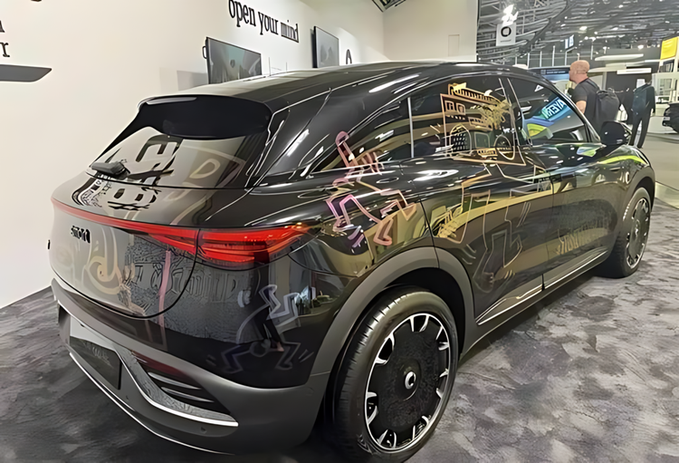 这台车是基于smart精灵#3 长续航版打造的,外观辨识度很强,一眼就能认出来:通体黑底+荧光黄涂鸦,车头盖上还盖印着个“跳舞小人”,没错,这正是Keith Haring的艺术灵魂徽标。