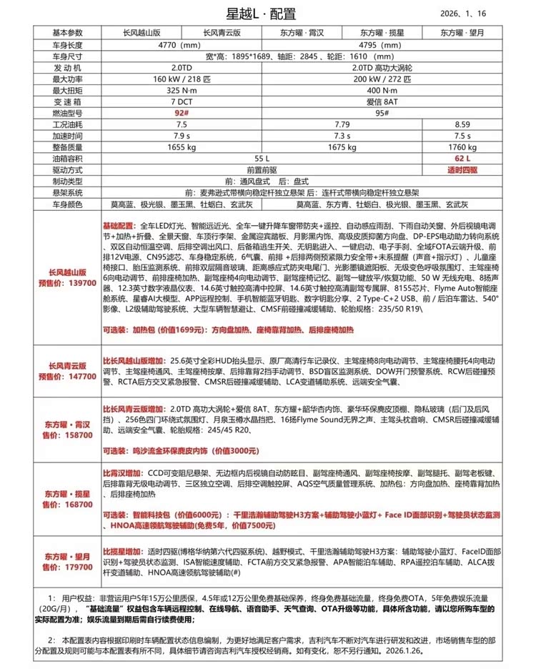 至于动力方面,26款长风系列将继续搭载2.0T发动机,最大功率160kW(218马力),峰值扭矩325N·m,传动系统匹配7速湿式双离合变速箱,不过根据配置信息显示,新车加92号汽油即可。底盘也依旧为带横向稳定杆的前麦弗逊式/后连杆式独立悬架。当然,关于新车的信息还有待官方进一步公布,那么,对于星越L全新长风系列您有什么看法,认为13.97万元起的预售价格合适吗?