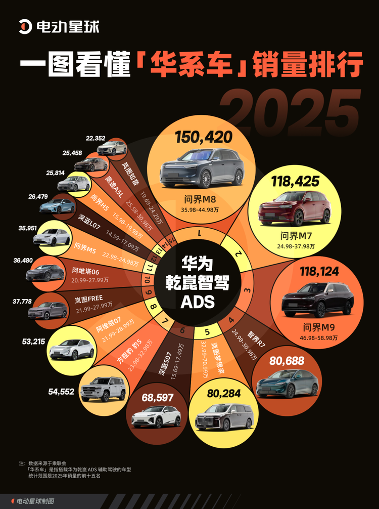 可以直观看到,年销量前五的「华系车」中有 4 款来自「鸿蒙智行」,且问界 M8、M7 和 M9,是仅有的三款年销量超 10 万的「爆款」车型。