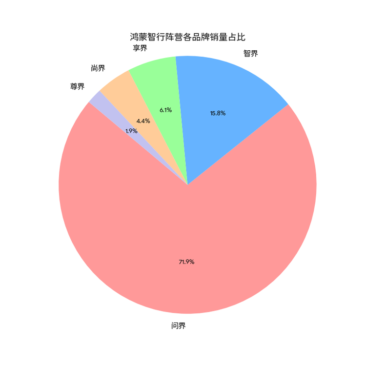 更深入地分析,在整个「鸿蒙智行」的阵营中,问界一个品牌就占到了整个阵营总销量的 71.86%(422920 台),其次是智界,占有 15.76%;享界 6.08%、尚界 4.39% 和尊界 1.92%。