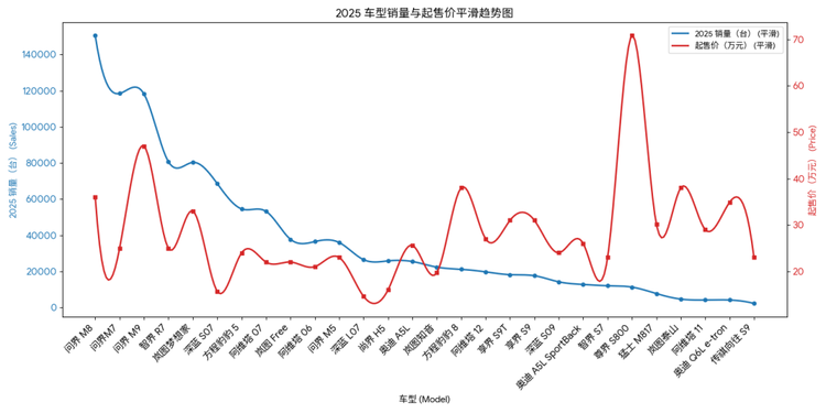 我们将「销量」和「价格」均加入到参考维度中,生成两条曲线,可以见到,「华系车」的主力销售区间是 20~30 万元价位段(拟合度更高的部分),该价位段中的车型合共贡献的销量超过 50 万台。