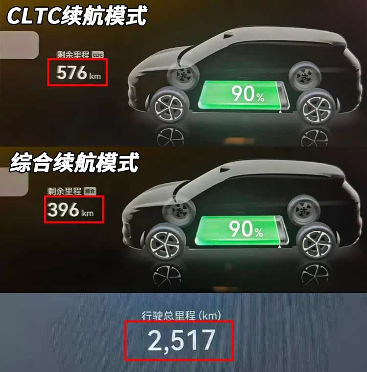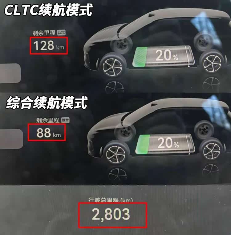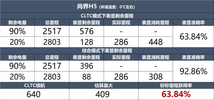 这辆车搭载了一块80千瓦时的三元锂电池,CLTC标称续航里程640公里。在北京冬季平均零下0摄氏度左右的气温下测试。充电至90%,CLTC表显续航里程576公里,综合续航里程396公里。行驶到电量剩余20%时,CLTC显示可续航里程128公里,综合可续航里程88公里。CLTC模式下表显消耗里程448公里,综合模式表显消耗里程308公里,实际行驶里程286公里。计算得出CLTC模式表显准确率为63.84%,综合模式表显准确率为92.86%。