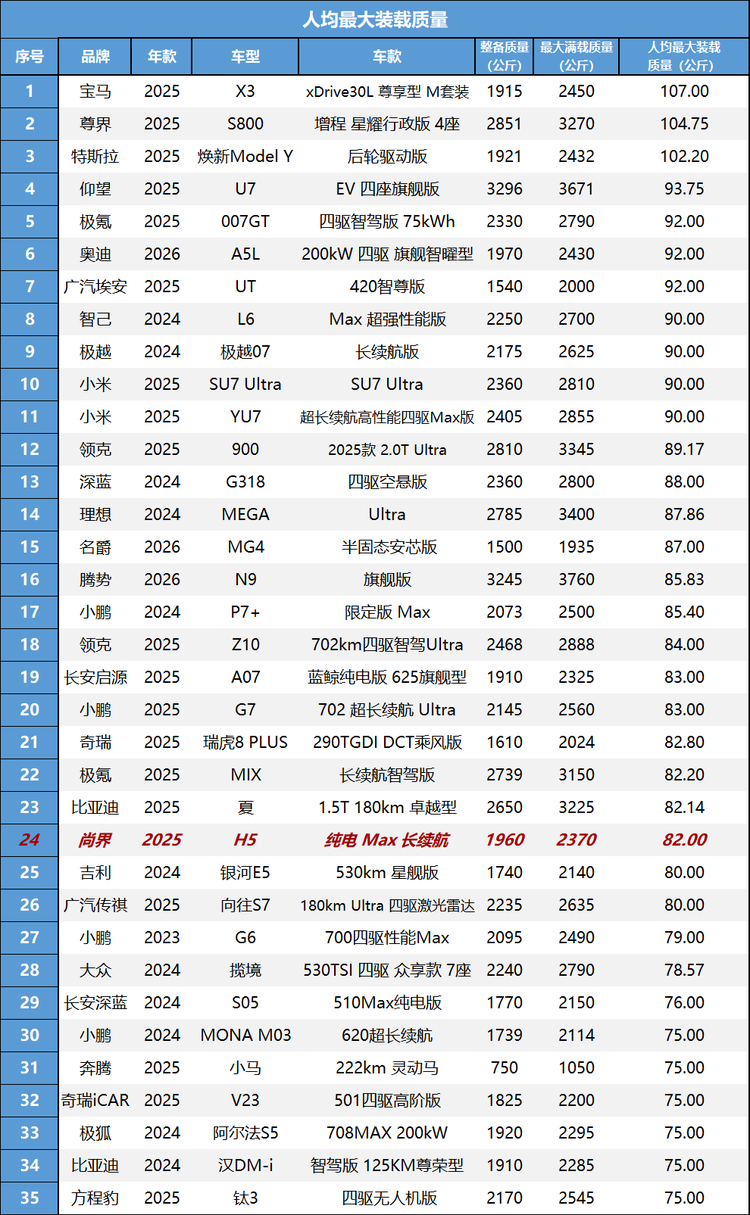 我们这辆车的整备质量为1960千克,最大满载质量为2370千克,计算得出这辆尚界H5 2025款纯电 Max 长续航的人均最大装载质量为82千克,超出标准7千克。