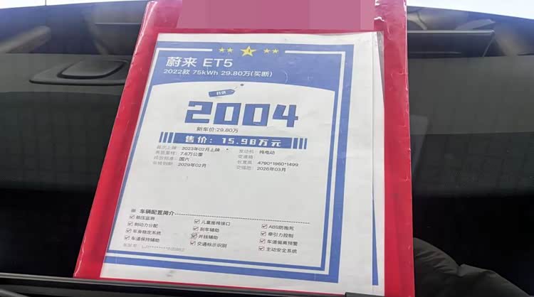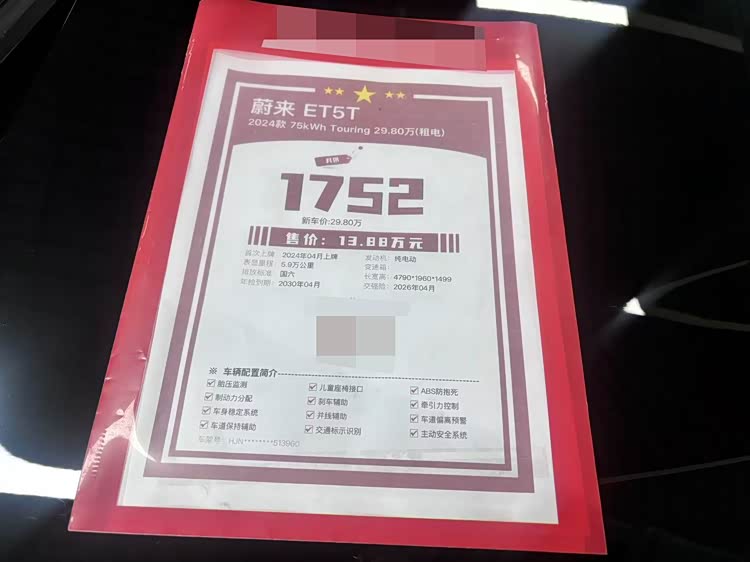 还有一辆2024年4月上牌的蔚来ET5T,新车租电价 29.8 万元,行驶5.9万公里,现在二手落地价 13.88 万元,1 年 9 个月折损 12.92 万元,保值率约为46.6%。
