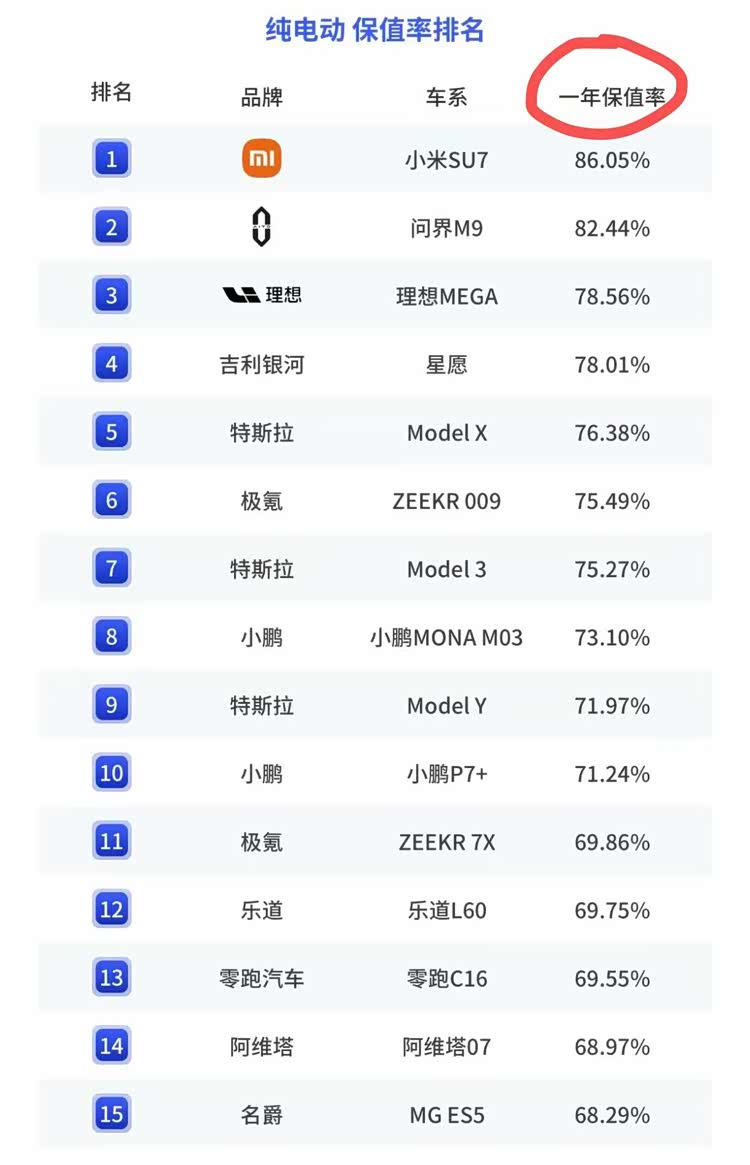 在写这篇文章的时候,我们也查看了中国汽车流通协会和第三方机构“精真估”在1月27日刚刚发布的《2025年度中国汽车保值率报告》(以下简称《报告》),因为小米SU7上市还未满三年,因此《报告》中也只有其一年保值率。