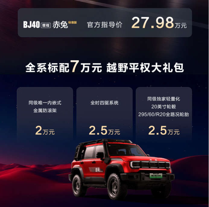 在当天发布的多款车型中,BJ40增程赤兔标准版无疑是最具“态度表达”的一款。北京越野董事长王昊在现场直言,BJ40一直拥有足够扎实的机械底子,而用户真正困扰的,是改装与合规之间的长期矛盾。赤兔标准版的出现,正是试图用“原厂改装”的方式,解决越野玩家“想改、敢用、能上路”的现实需求。27.98万元的官方指导价之下,车辆将防滚架、全时四驱系统、20英寸轻量化轮毂及全路况轮胎等高价值配置一次性整合进原厂方案,避免了后期改装的反复投入与年检隐忧,也让个性化不再游走于规则边缘。