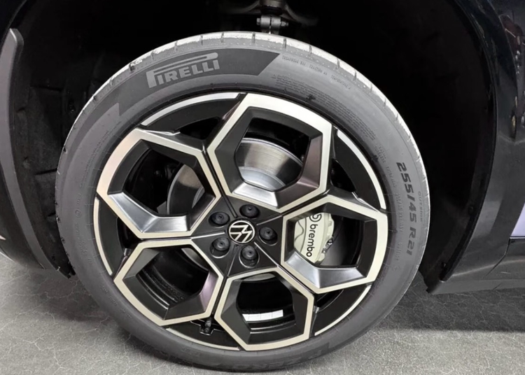 车轮部分,实拍这款与众08用了倍耐力的P Zero E轮胎,规格为255/45 R21,市场价在1500-1700元/条。并且,从上图可以清晰地看到Brembo刹车卡钳,这也是一个相对高端的配置,而据我们所了解,与众08是全系标配4活塞Brembo卡钳。