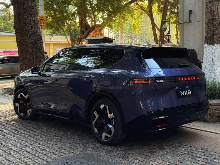 车身部分,日产NX8的设计同样是顺应了当下潮流,溜背线条和锐利的腰线,赋予了这个大块头难得的动感韵律,隐藏式门把手与低风阻轮毂是细节上的加分项,让侧面观感浑然一体,车尾的贯穿式尾灯设计精致,内部构造颇有心思,可以说与整车科技风格一脉相承;此外,在车身尺寸上,新车的长宽高分别为4870/1920/1680mm,轴距达到了2917mm,定位中大型SUV,可以说为宽敞的空间奠定了良好基础。