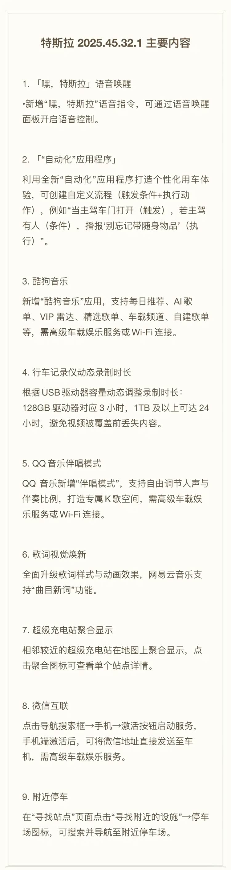 近日,我们从相关渠道获悉,特斯拉将迎来2025.45.32.1版本OTA升级。新版本并未涉及动力、电池或硬件结构调整,而是将重点放在车机交互逻辑和使用场景的完善上。这一轮更新主要围绕语音系统、车内应用以及生态互联展开,目标并不是改变车辆属性,而是降低操作成本、提升使用连贯性。从功能分布来看,属于典型的“高频体验型”OTA,适合日常通勤和城市用车场景,对现有用户的实际感知较为直接。