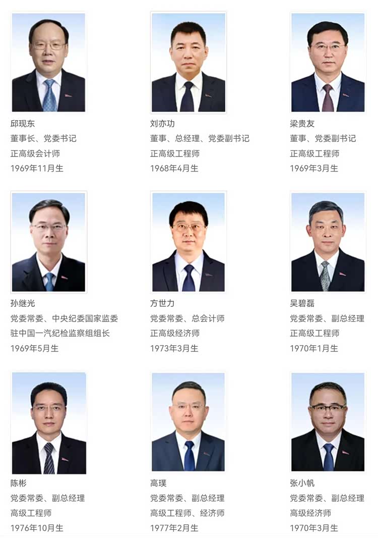 他们分别是邱现东(董事长、党委书记)、刘亦功(董事、总经理、党委副书记)、梁贵友(董事、党委副书记)、孙继光(党委常委、纪委书记,驻一汽纪检监察组组长)、方世力(党委常委、总会计师)、吴碧磊(党委常委、副总经理)、陈彬(党委常委、副总经理)、高璞(党委常委、副总经理)。