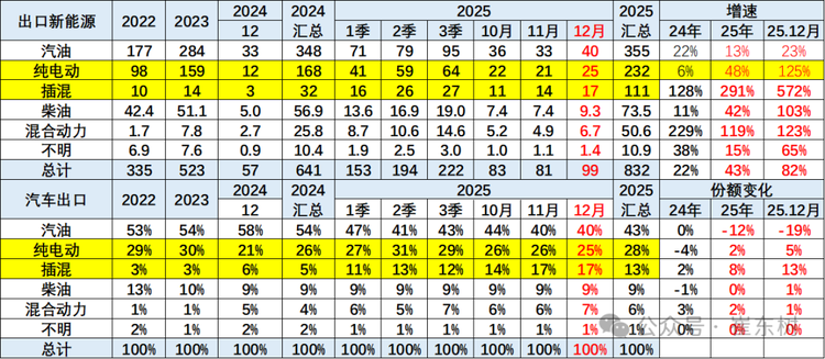 2025年全年中国汽车出口中纯电动占比28%,同比增长2%;插混占比13%,同比增长8%;混动占比6%,同比增长2%;纯燃油车占比43%,同比下降11%。