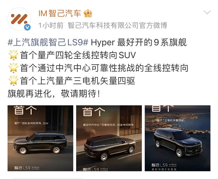 车家号·0浏览·2026-01-28 16:40 · 广东1月28日,我们从智己汽车官方获取到了一组 智己LS9(参数|询价) Hyper的外观官图。该车是首款采用上汽量产三电机矢量四驱的车型,并且支持四轮全线控转向。据悉,智己LS9 Hyper将于近期正式亮相。