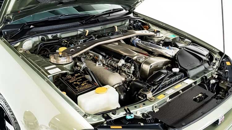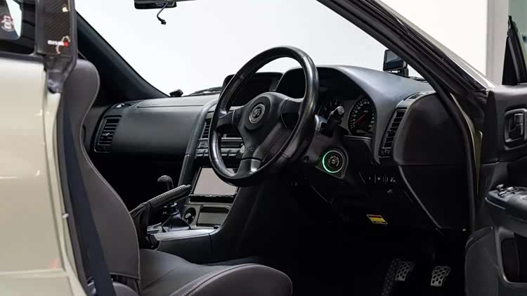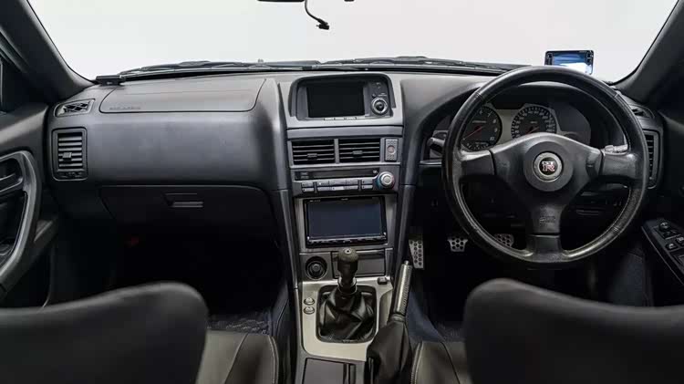内饰方面,车辆保留原装M-Spec黑色皮革包裹的前排桶椅,升级了现代化的Eclipse车机主机,整体看来历年保养状况良好。车身涂装为Millennium Jade,这可谓是R34上最具收藏价值的颜色,也是其视觉魅力与市场吸引力的关键因素之一。