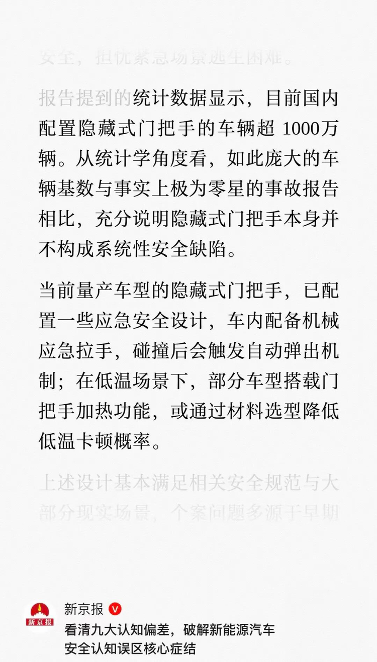 近日,中国经济信息社与中国汽车工程研究院联合发布《2025新能源汽车安全认知报告》,其中用“隐藏式门把手的车辆存量已超过一千万辆”的基数统计,专门为大家澄清了关于隐藏式门把手的误区。