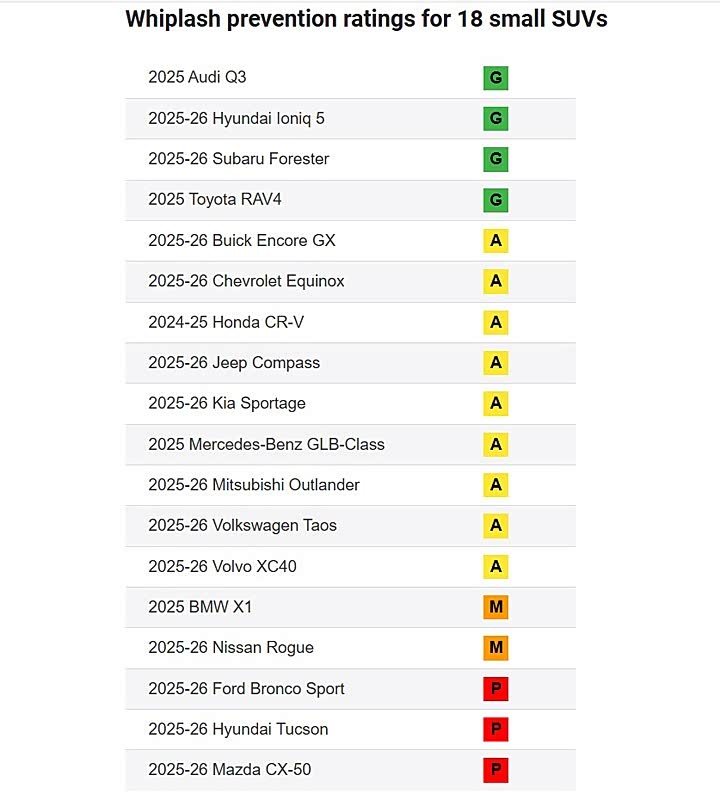 美国 IIHS 近日推出全新的座椅与头枕评测,重点便是针对追撞事故中造成的颈部伤害进行评估,也就是鞭甩的测试,而在首批的测试一共有 18 款 SUV,不过最终仅有奥迪 Q3、现代 IONIQ 5、斯巴鲁 森林人(参数|询价)和丰田 RAV4 获得了 Good ( 优良 ) 评级,而被评为 Acceptable ( 可接受 ) 的则有 9 款、Marginal ( 边缘 ) 有 2 款,至于福特 Bronco Sport、现代 Tucson 和 Mazda CX-50 则是 Poor ( 差 ) 的成绩。
