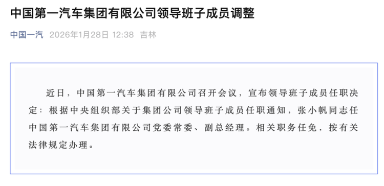近日,中国第一汽车集团有限公司宣布一项重要人事调整:张小帆出任公司党委常委、副总经理。此项任命系根据中央组织部关于央企领导班子成员的任免通知作出,相关程序将依规履行。