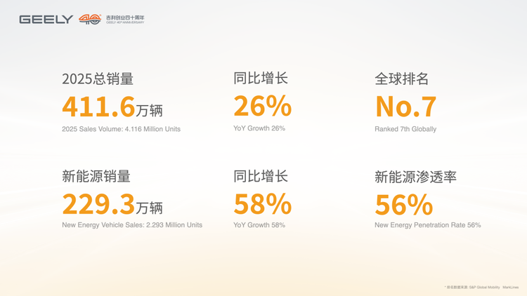 过去的2025年,是吉利厚积薄发的收获之年。正如吉利控股集团CEO 安聪慧介绍面对行业大变局的“关键时刻”,吉利展现了稳健的发展态势。全年销量高达411.6万辆,同比增长26%,位列全球第七,在全球车企前十中增速最快。
