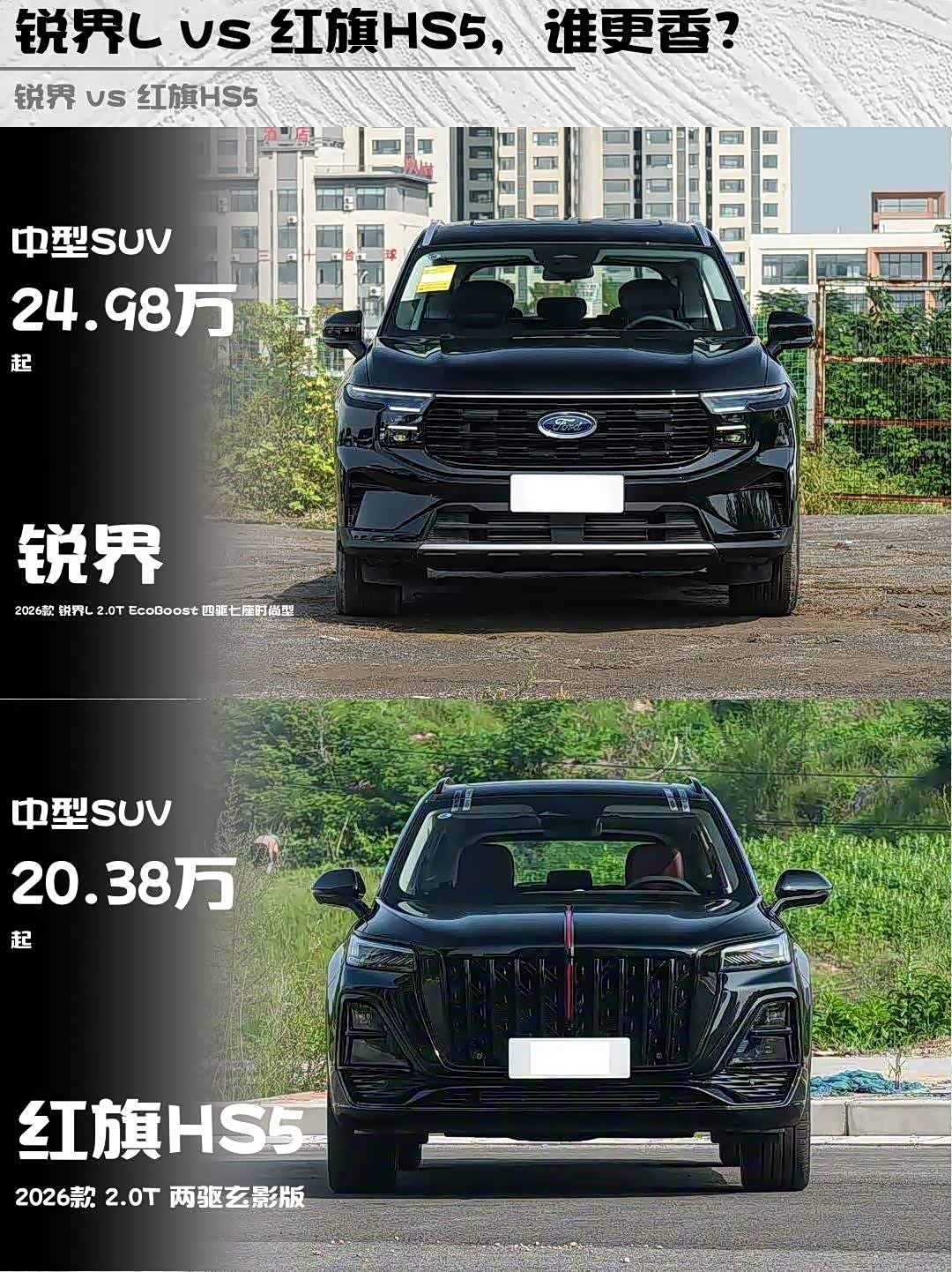 最近后台好多兄弟在问25万预算买中型SUV,2026款锐界L和 红旗HS5(参数|询价)到底怎么选?今天直接拿顶配的2026款锐界L 2.0T四驱七座时尚型(24.98万)和红旗HS5 2.0T两驱玄影版(20.38万)来波硬核对比,看完你就知道该冲哪台了!🚗💨