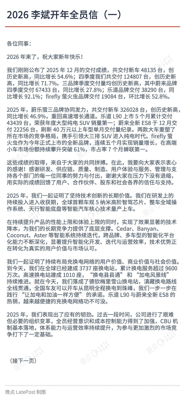 ○ 2026 年李斌开年全员信(图片来源:晚点Auto)
