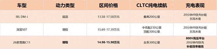 这是选新能源车的核心顾虑。宋L DM-i是插混车型,CLTC纯电续航最高都到200公里,按每天40公里通勤算,大概一周得充两次电,长途能切换混动模式省着用电。深蓝S07是增程路线,中低配纯电续航230公里,比前两款稍宽裕,顶配能到300公里,但顶配价格已超出15万主力区间。零跑C11增程版不分高低配,全系纯电续航都是300公里,日常通勤一周一充完全够用,周末300公里内短途也能纯电覆盖。充电速度上,四款车快充都能做到20分钟内补能,属于主流水准,零跑C11的800V高压平台略占优势,补能效率稍快一点,对依赖公共充电桩的用户更友好。