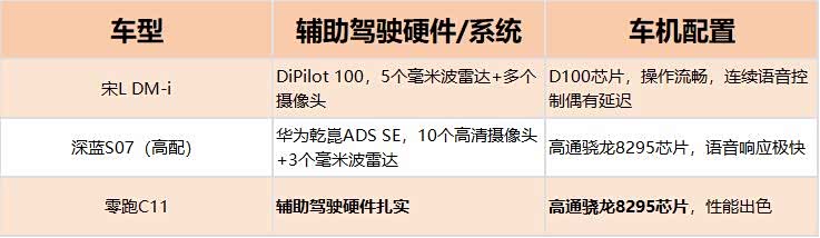深蓝S07高配(华为乾崑ADS SE版)配置更足,10个高清摄像头+3个毫米波雷达,支持高速自动进出匝道、遥控泊车,车机是高通骁龙8295芯片,语音响应极快,还带55英寸AR-HUD。