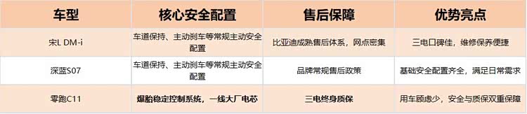 零跑C11也有爆胎稳定控制系统,电芯采用一线大厂产品,还提供三电终身质保,用车顾虑更少。四款车在安全配置上各有侧重,售后方面比亚迪的网点优势和零跑的质保政策,分别对应不同用户需求。