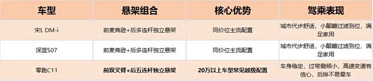 深蓝S07、宋L DM-i都用了同价位主流的前麦弗逊+后多连杆独立悬架,日常城市代步足够舒适,小颠簸过滤得比较到位,满足家用需求没问题。