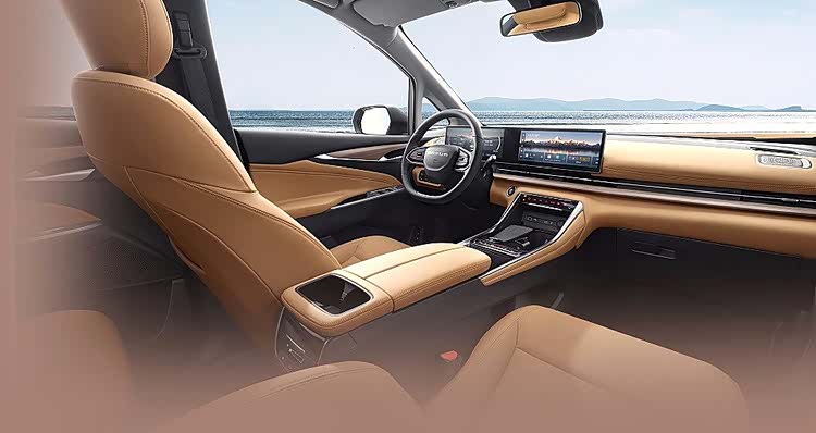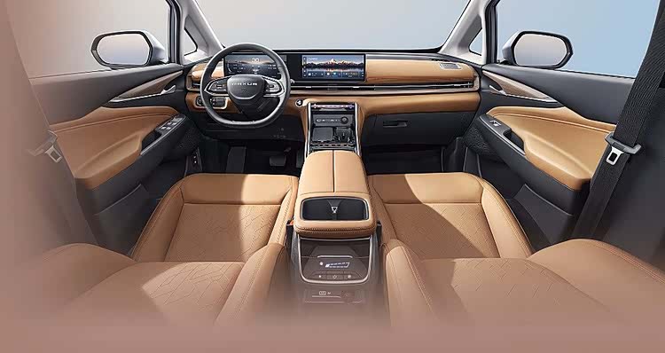 内饰与舒适性配置方面,座舱采用2+2+3的七座布局,座椅材质为仿皮,最引人注目的是中控台搭载的12.3英寸触控液晶屏,与12.3英寸全液晶仪表盘共同营造出强烈的科技氛围。