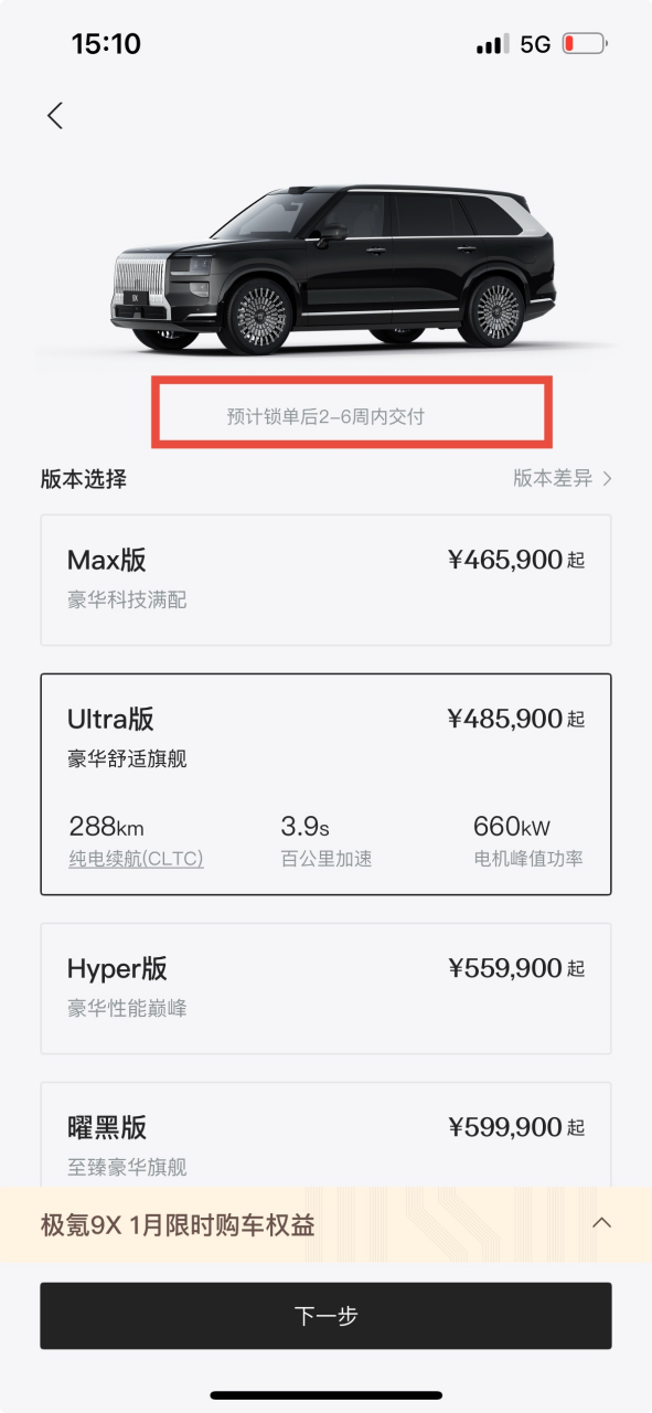 极氪旗下豪华旗舰SUV车型 极氪9X(参数|询价)的Max、Ultra版交付期大幅缩减。1月28日,记者查询极氪App发现,9X的Max、Ultra版提车周期已缩短至2-6周。