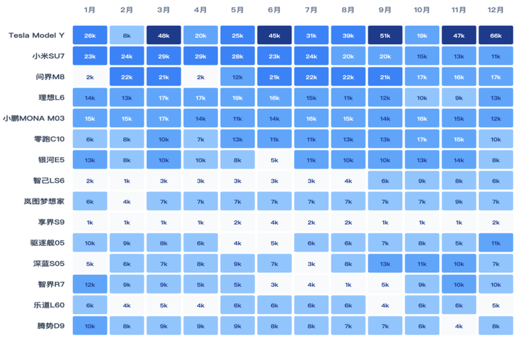 ▲ 重点车型月度销量走势。制图 / 每人Auto热力图则清晰呈现出各车型在全年市场竞争中“热度”的持续性与稳定性。正是这些分化的轨迹,共同指向了当下正在生效的、更为残酷的一套新规则。
