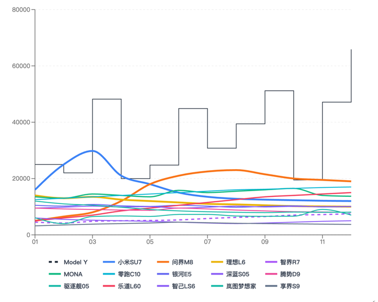 作为鸿蒙智行的一员,它拥有华为技术的加持,开局销量破万。但其后续的震荡下行,直至年底才艰难回升,反映出在内部与问界系列定位重叠、外部同价位竞品林立的双重压力下,未能及时建立起独特、清晰的产品定位与用户认知。